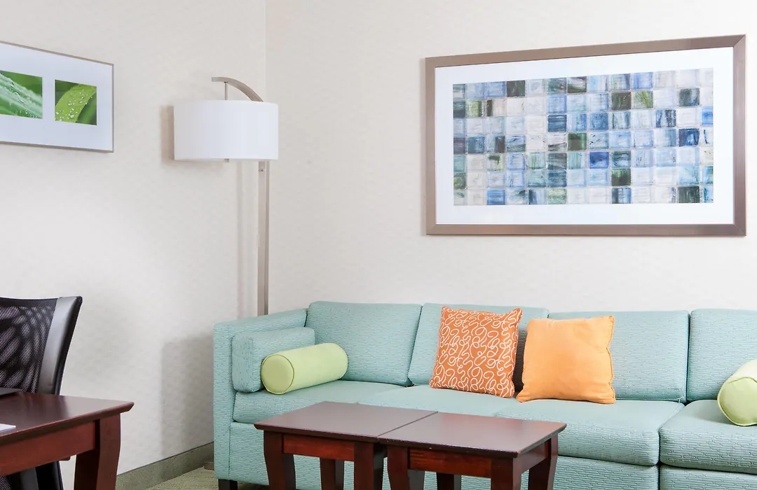 Rooms at SpringHill Suites feature spacious studio suites with a separate sitting area, premium bedding, and a kitchenette including a microwave and mini-fridge. Options include King, 2 Double, or 2 Queen Suites equipped with pull-out trundle beds, catering to families or groups. Each room also provides high-speed WiFi and air conditioning.